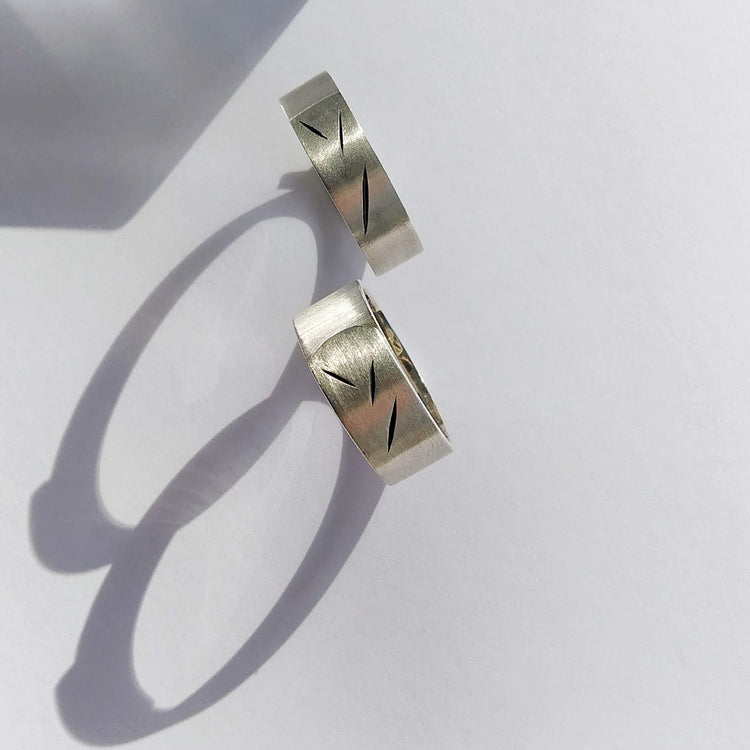 We chose five features, five designs to be developed on different pieces. They are all connected with our previous works and artistic history: rough surfaces, oxidations and simple, geometric shapes. Each feature is used for a band, a ring, a bracelet and a pendant.