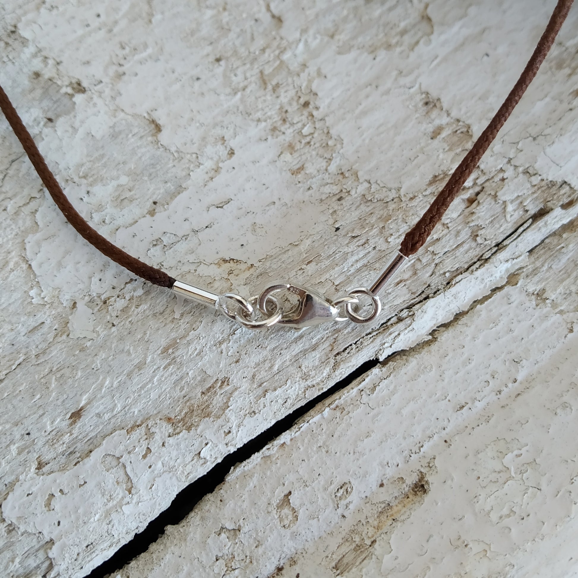 Il Ciondolo Black Rust n.3 è disponibile in un unica misura, con cordino in cotone marrone e chiusura in argento . Nonostante la lunghezza standard della collana sia di cm. 52, possiamo farla di lunghezze diverse, a seconda delle richieste