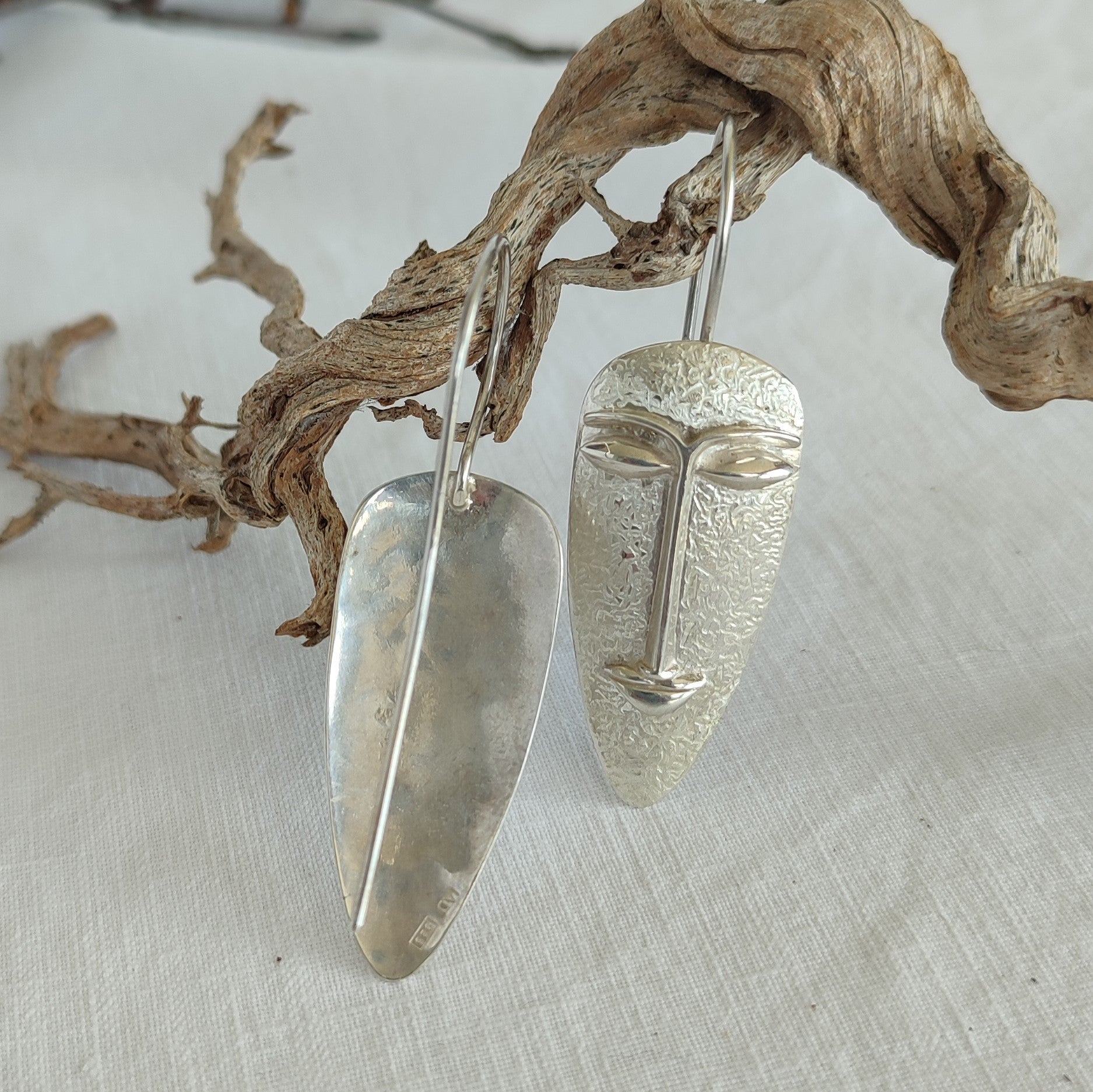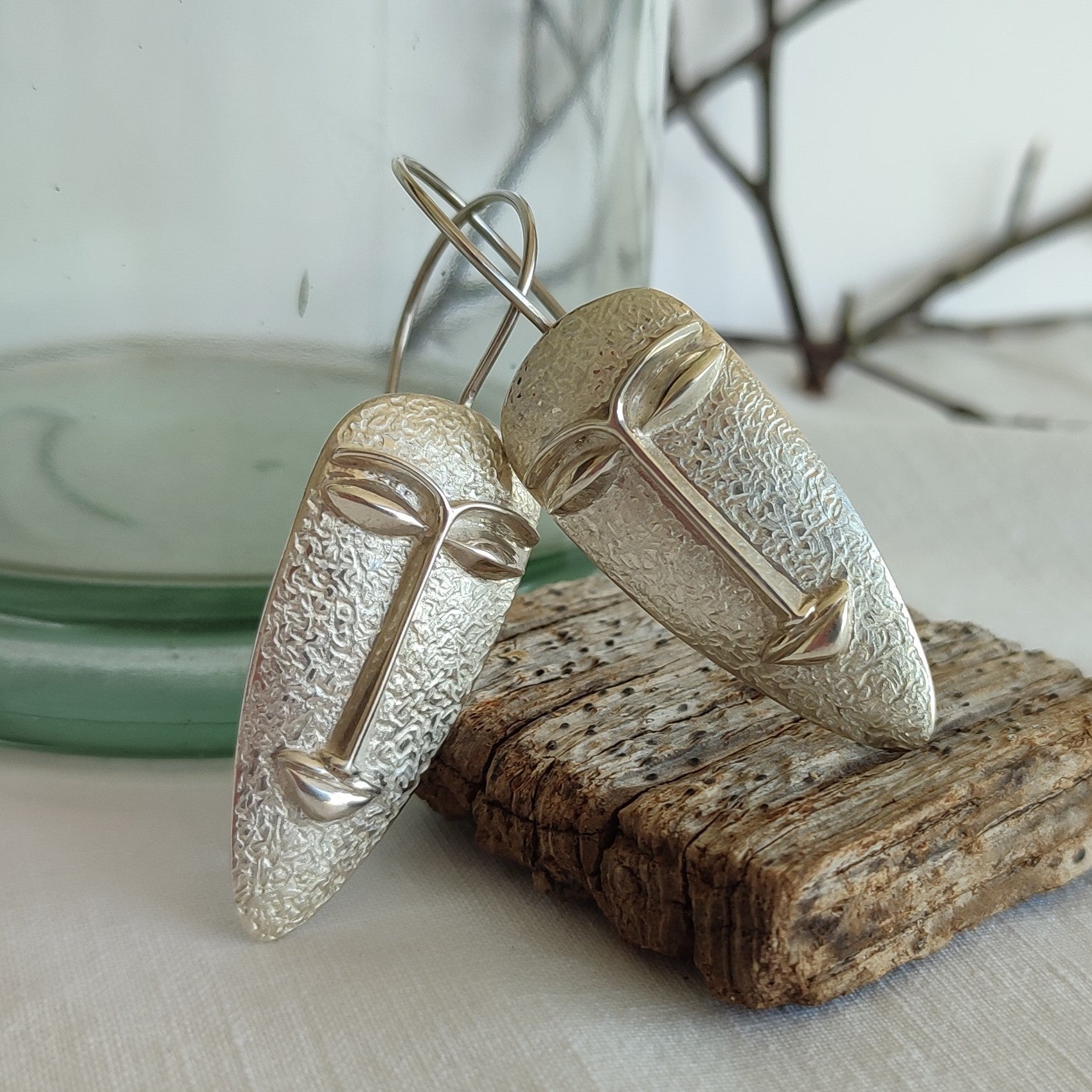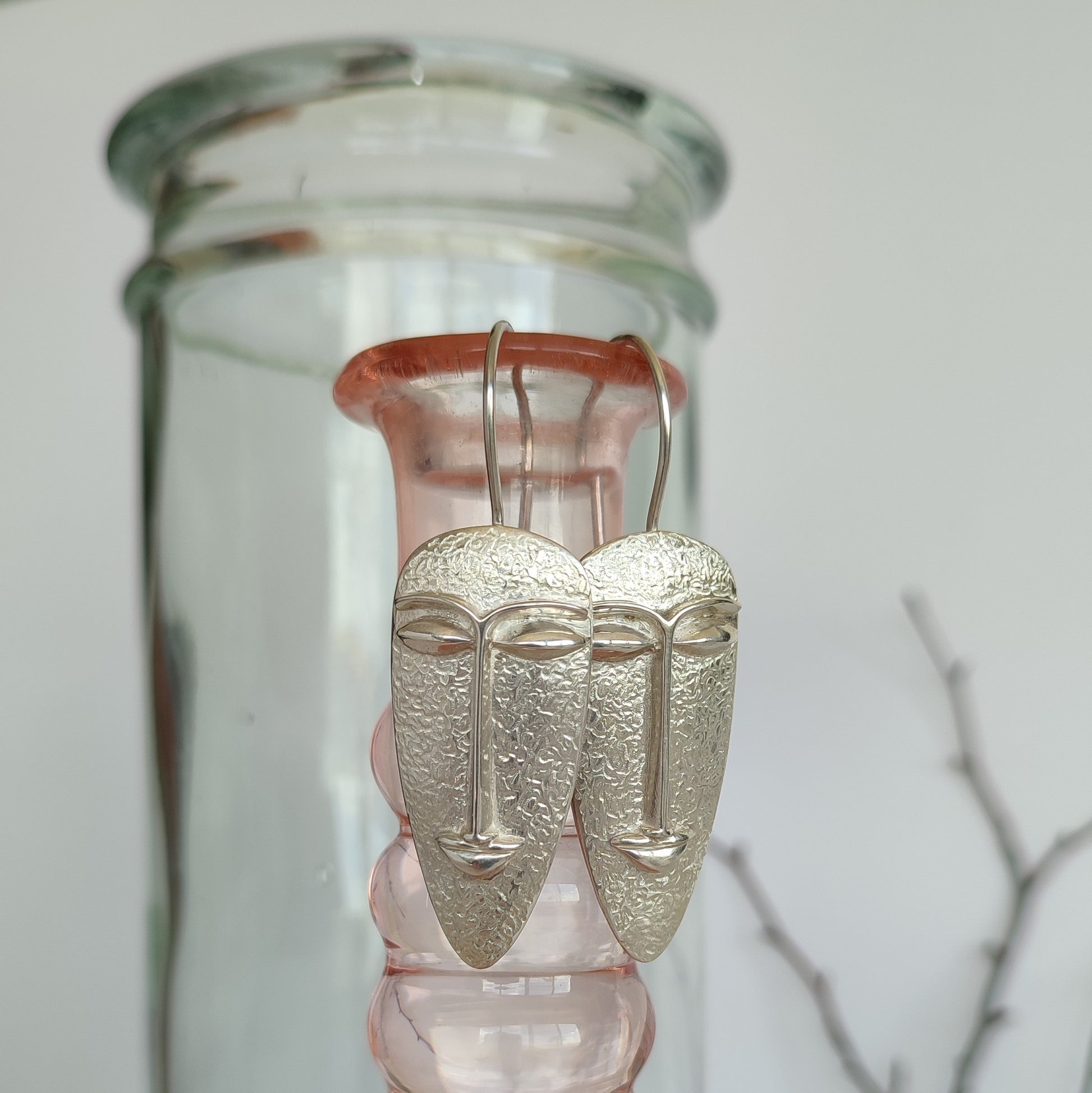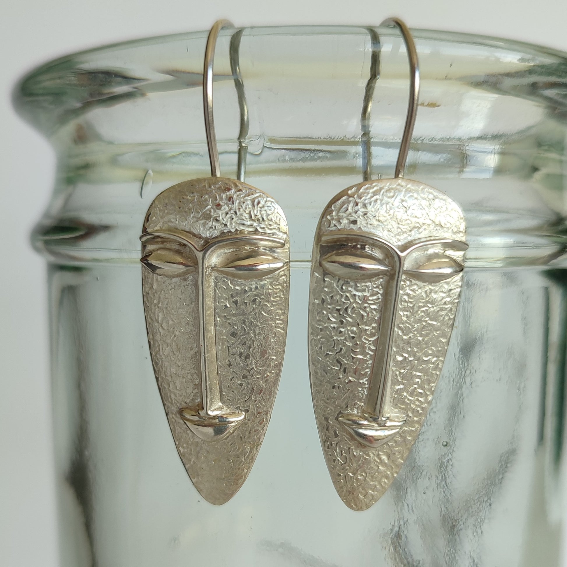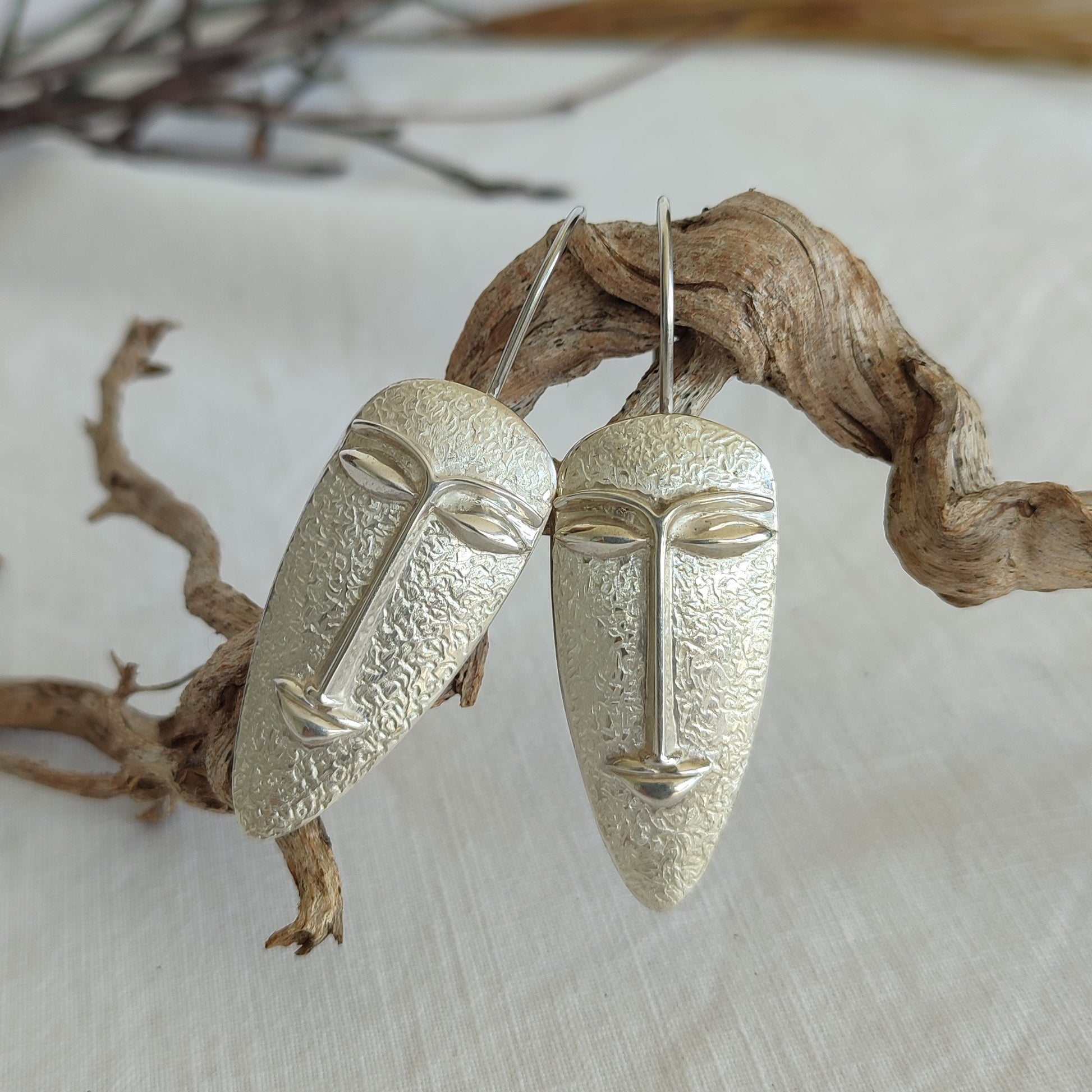 Un bellissimo paio di orecchini in argento ispirati alle sculture dell'artista italiano Amedeo Modigliani, scolpiti a mano in cera, fusi e accuratamente rifiniti